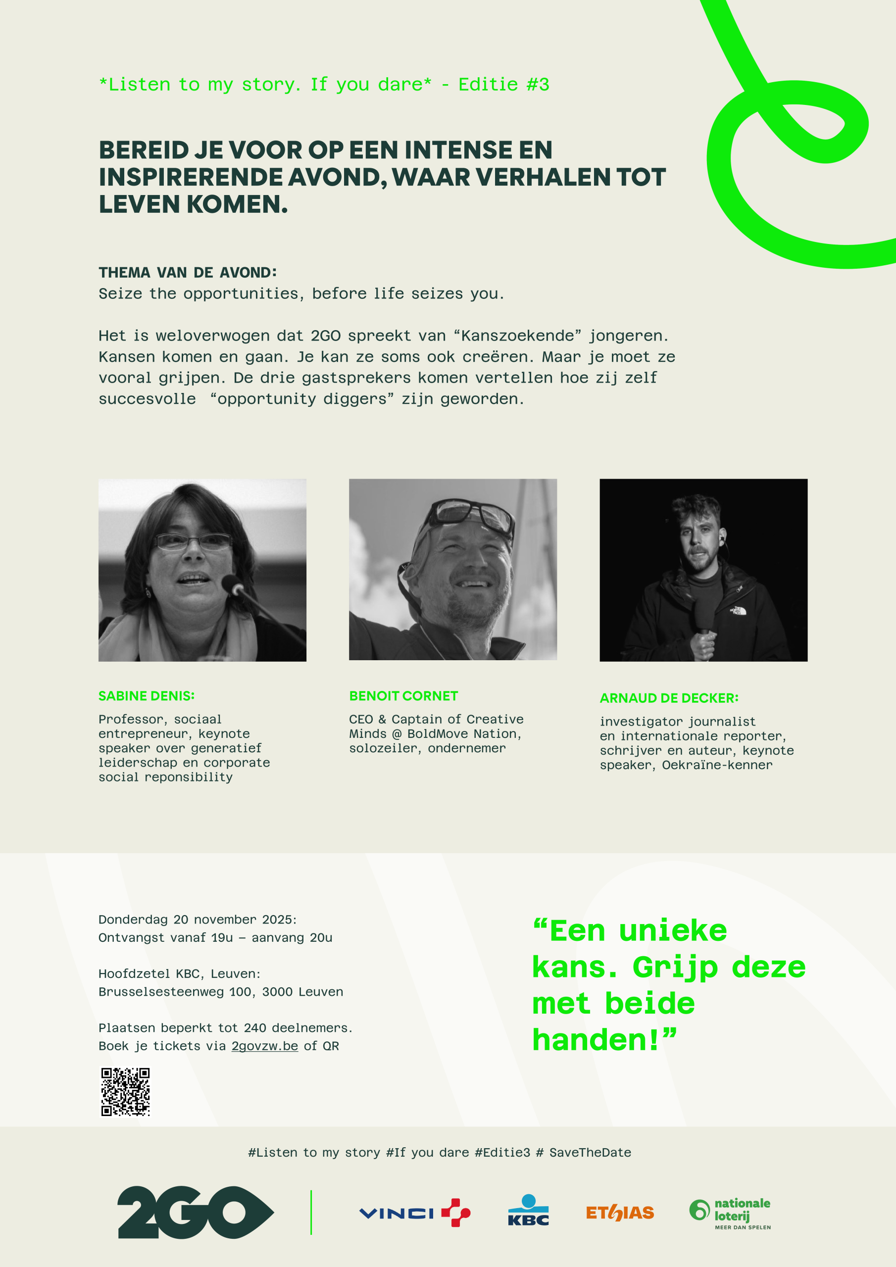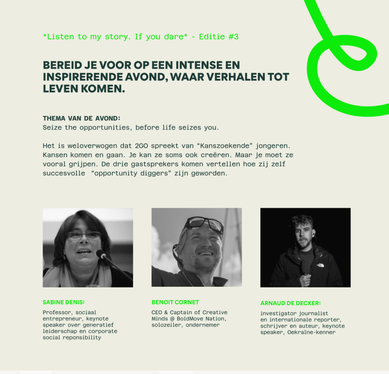 Het is weloverwogen dat 2GO spreekt van “Kanszoekende” jongeren. Kans komen en gaan. Je kan ze soms ook creëren. Maar je moet ze vooral grijpen. De drie gastsprekers komen vertellen hoe zij zelf succesvolle “opportunity diggers” zijn geworden.